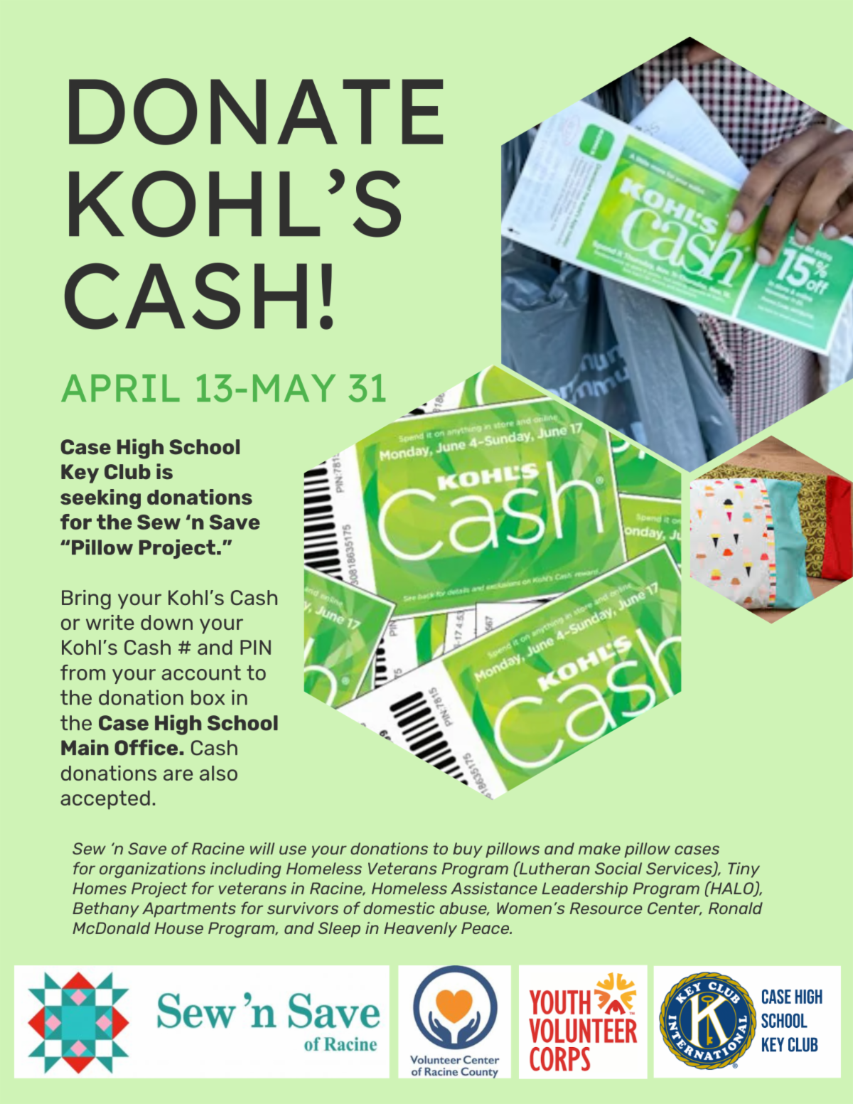 The Case Key Club (sponsored by the Volunteer Center & Kiwanis Club of West Racine) will be holding a fundraiser to collect Kohl’s Cash for Sew ‘n Save of Racine. The Kohls cash will go towards purchasing pillows for such organizations as the Homeless Veterans Program, the Tiny Homes Project in Racine, HALO, Inc., Women’s Resource Center, Bethany Apartments, Ronald McDonald House, and Sleep in Heavenly Peace.