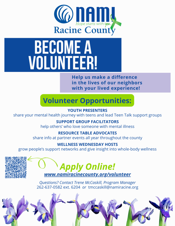 Our dedicated volunteers are the heart of NAMI Racine County. Volunteers play a vital role in improving the lives of individuals and families affected by mental health conditions by sharing their lived experiences, talents, time, and skills.